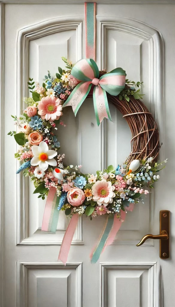 A welcoming front door is the perfect place to display a DIY spring wreath made with inexpensive materials.