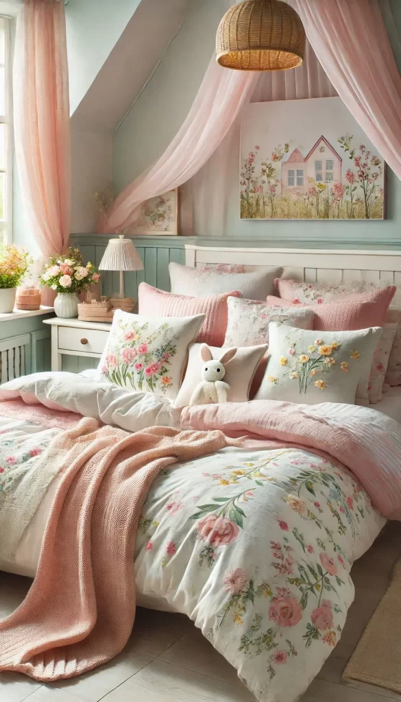 - Choose bedding in soft pastel colors, florals, or subtle patterns.