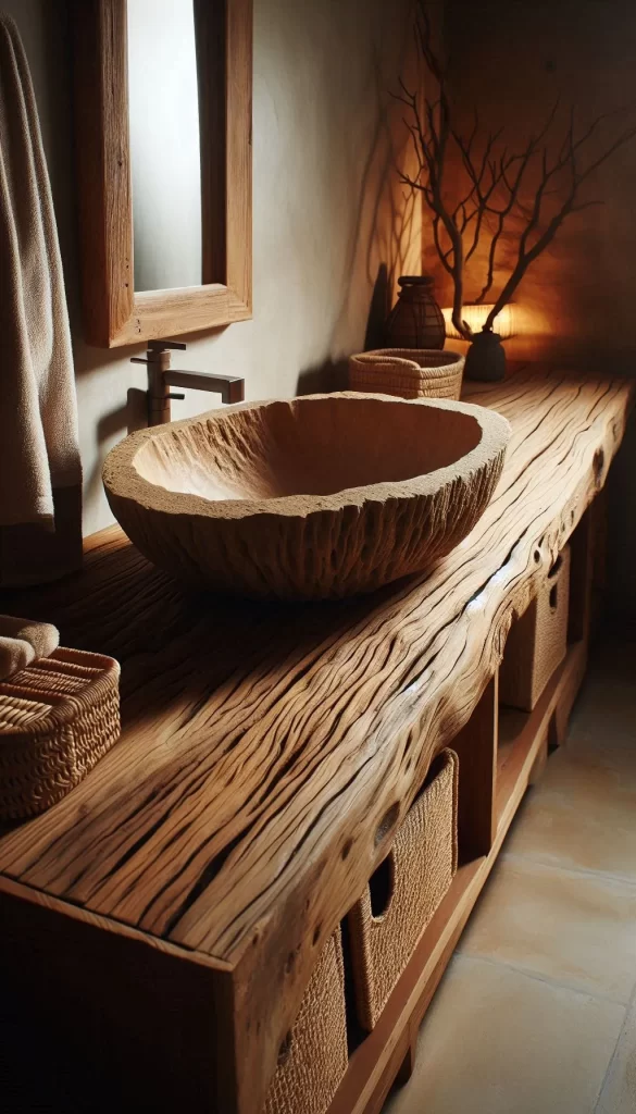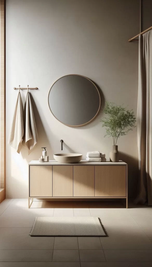 - Natural Wood Furniture: Incorporate simple wooden vanities, shelves, and stools.