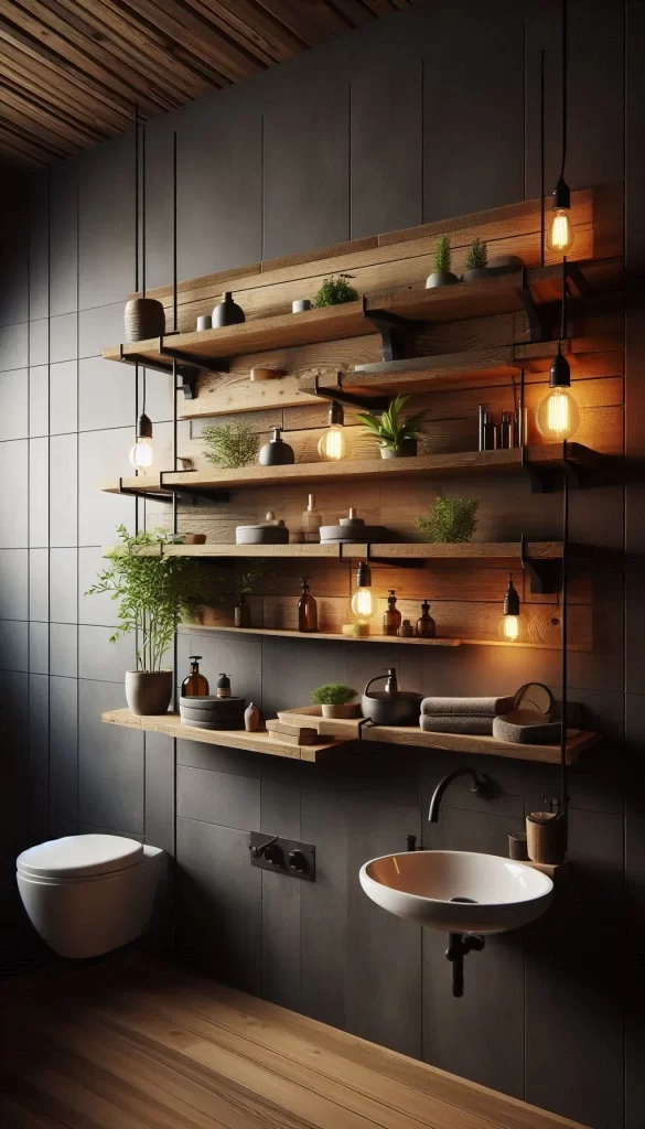 - Light Wood Tones: Opt for light wood vanities and shelving.