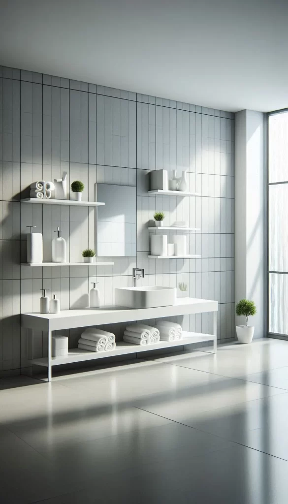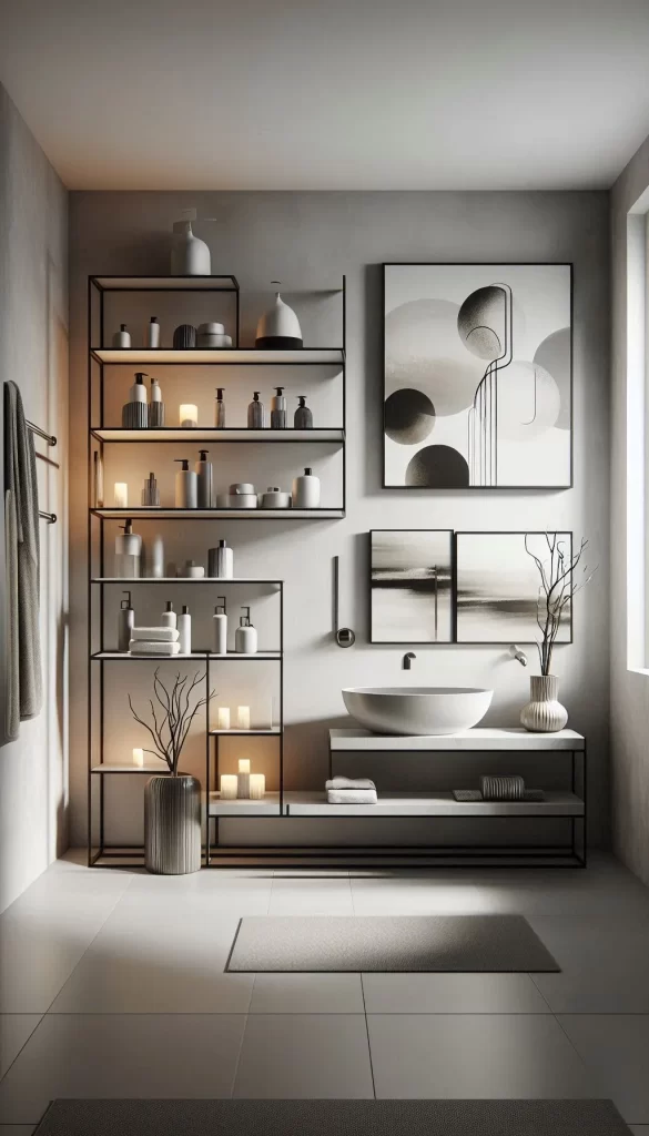 Utilize open shelving to display your stylish bathroom essentials and decorative items, adding both functionality and visual appeal.