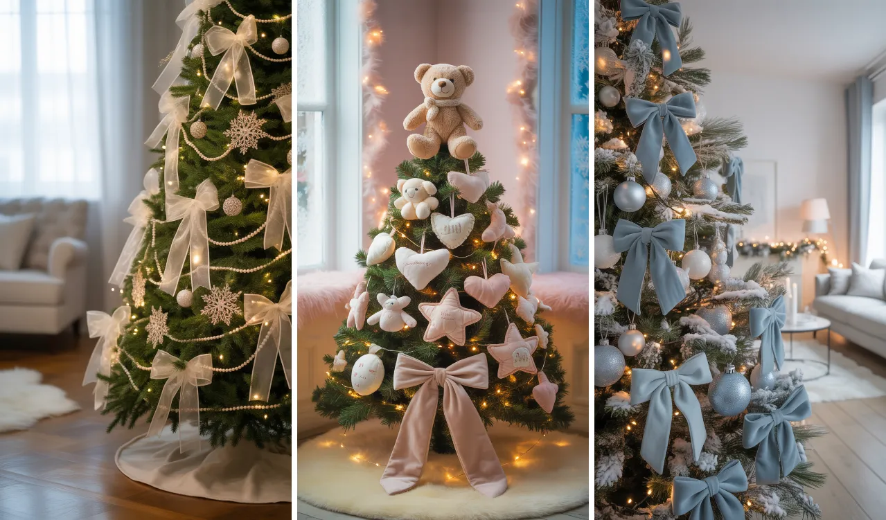 Blush pink bows bring a soft and gentle charm to your Christmas tree. The pastel color feels warm and loving, making the tree look sweet and inviting. Pairing pink bows with white or rose-gold ornaments creates a beautiful, cozy style that looks soft in daylight and magical at night. This idea works especially well in bedrooms, nurseries, or any space where you want a cute winter vibe.