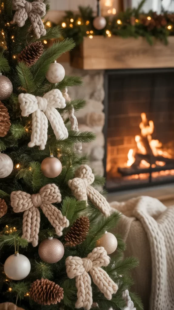 This idea works well in living rooms where you want the holiday décor to feel relaxed and welcoming. The knit texture reminds you of warm blankets, hot cocoa, and cozy winter nights. A few knit bows go a long way, so even a small number can make your tree feel extra inviting. It’s the perfect “curl up with a blanket” Christmas style.