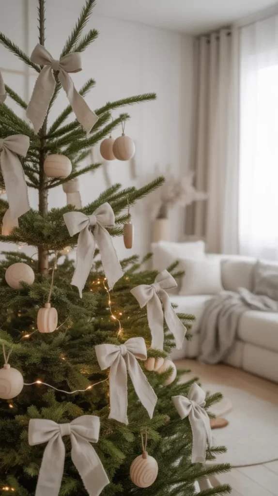Neutral linen bows create a calm, slow-living holiday style. The natural fabric looks gentle and cozy, perfect for a peaceful winter home. Linen bows also add texture to the tree without making it look crowded or too decorated. This style pairs well with wooden ornaments, handmade crafts, and simple white lights.