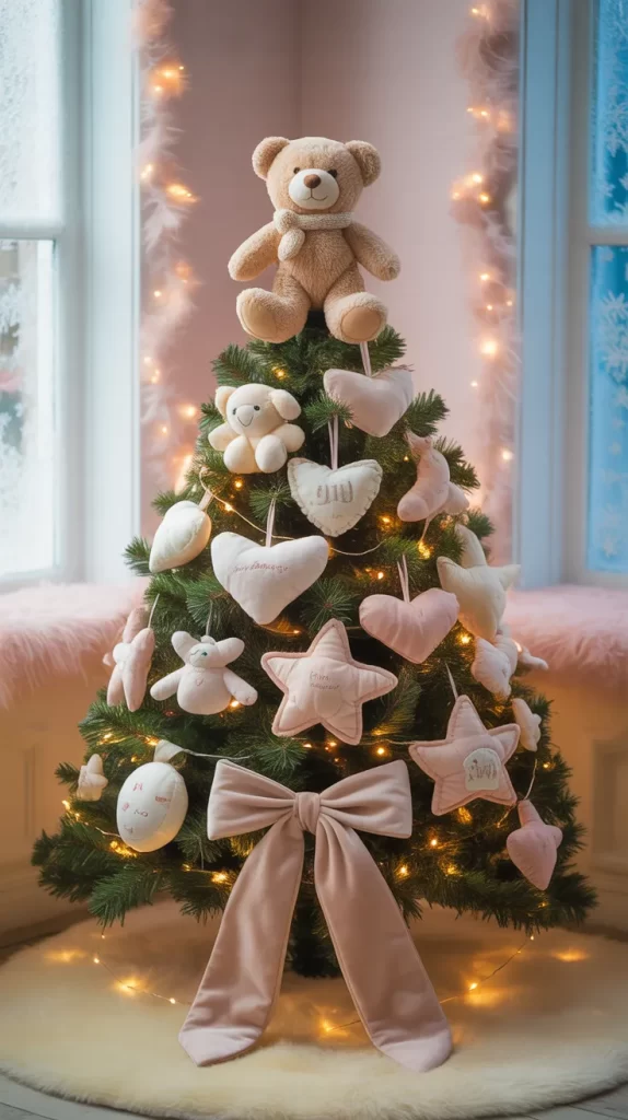 This idea is perfect for kids, nurseries, or anyone who loves adorable holiday décor. Add small teddy bear ornaments or soft textures to match the topper. The whole tree will look charming, loving, and full of joy.