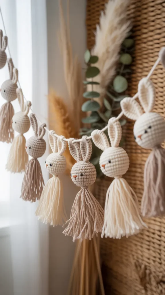 Boho bunny garlands include fringe tails, tassels, or macrame details. They pair well with woven decor and neutral walls, making them popular for Pinterest-inspired homes.