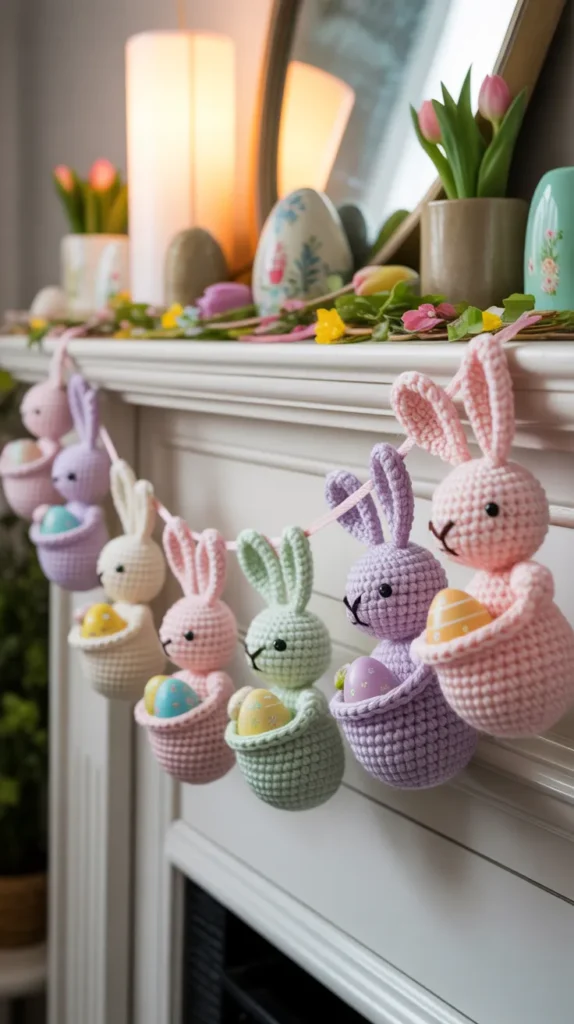 A classic pastel Easter Bunny Crochet Garland uses soft shades like baby pink, mint green, lavender, and cream. Each bunny is crocheted in simple shapes and strung together with yarn or twine. This timeless design looks beautiful over fireplaces, windows, shelves, or Easter dessert tables. Pastel garlands remain popular because they blend easily with most spring decor themes and create a light, welcoming feeling.