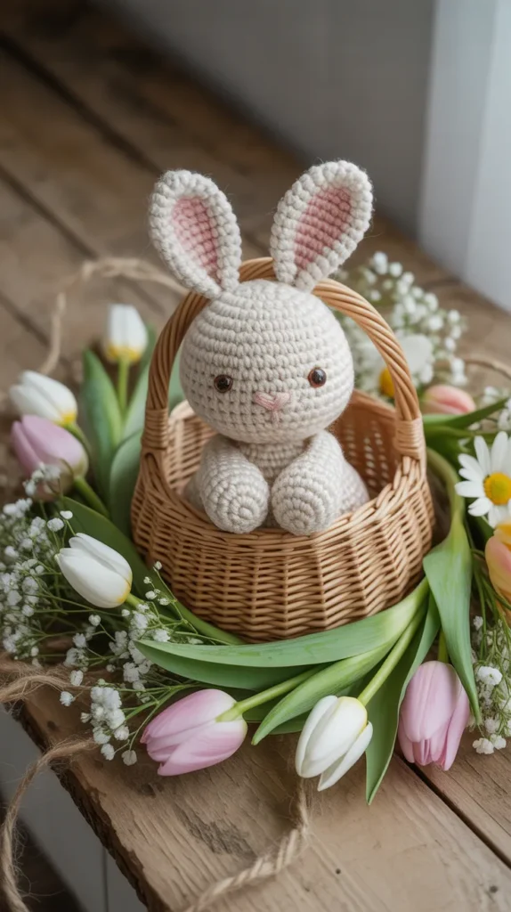 Tiny bunnies sitting in crochet baskets create a storybook look perfect for shelves or dessert tables.