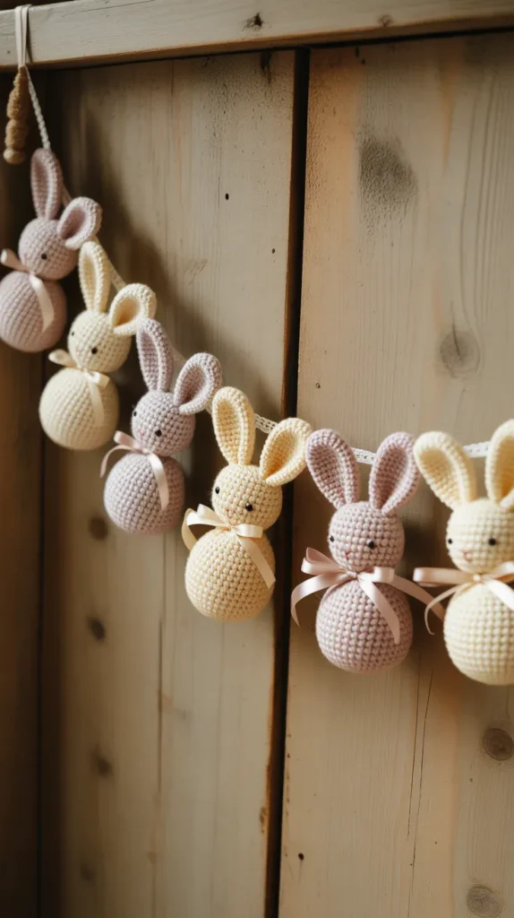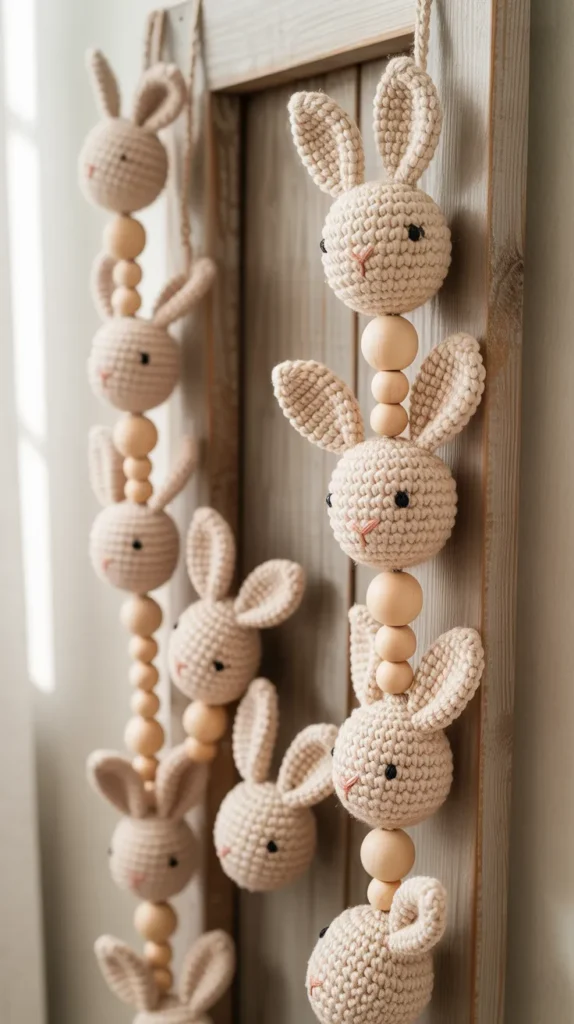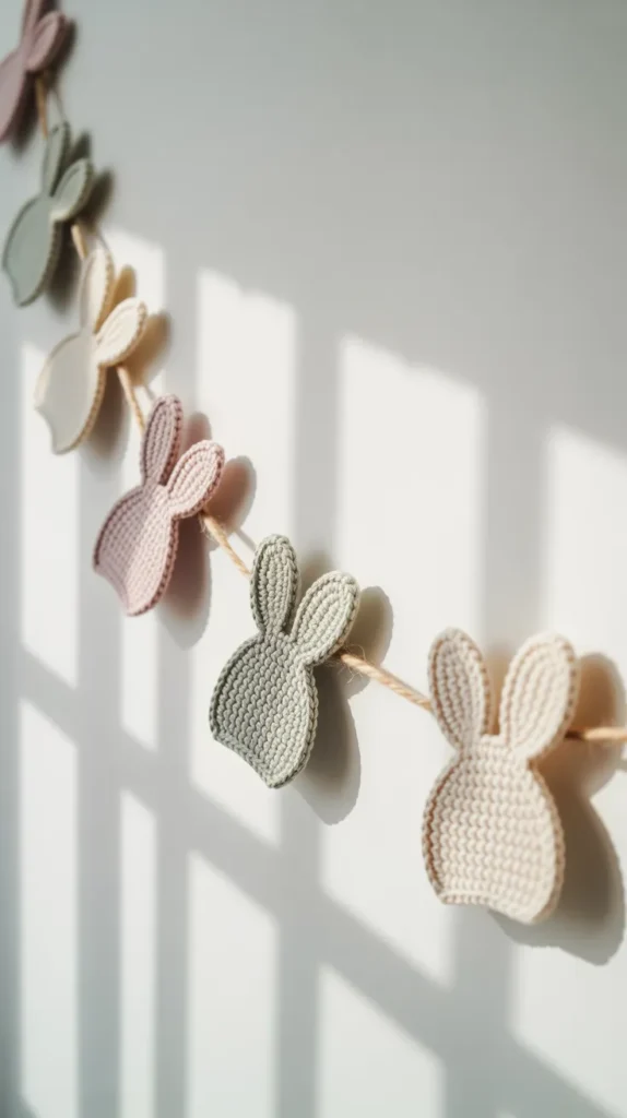 Farmhouse bunny garlands use neutral yarn colors like beige, ivory, and soft gray paired with cotton rope or jute. Wooden beads or tassels between bunnies add texture without making the design busy. This style fits modern farmhouse homes and minimalist spaces where bright colors feel overwhelming.
