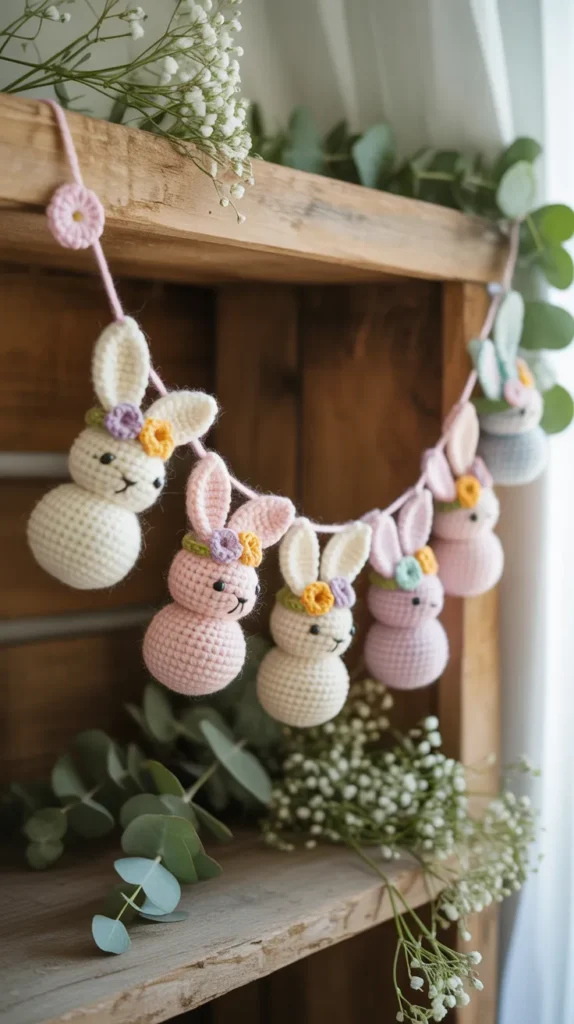 Floral crown bunny garlands add small crocheted flowers or embroidered blooms to each bunny’s head. This creates a soft cottage-style look that feels romantic and spring-ready. These garlands look beautiful above beds, across shelves, or as party backdrops for Easter brunch.