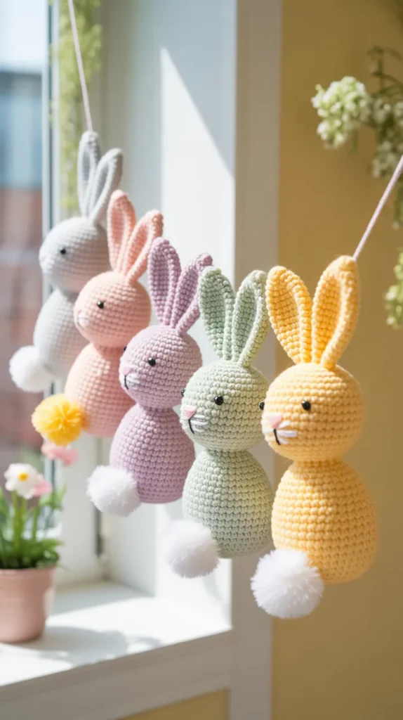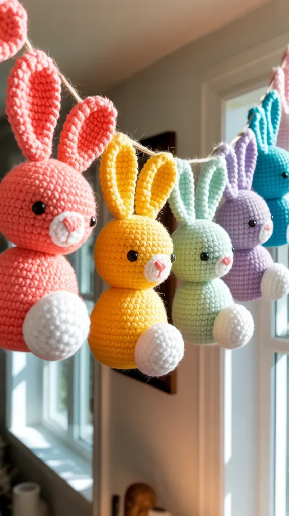 Rainbow bunny garlands use colorful yarn stripes to create cheerful designs. They’re great for playrooms and classrooms.
