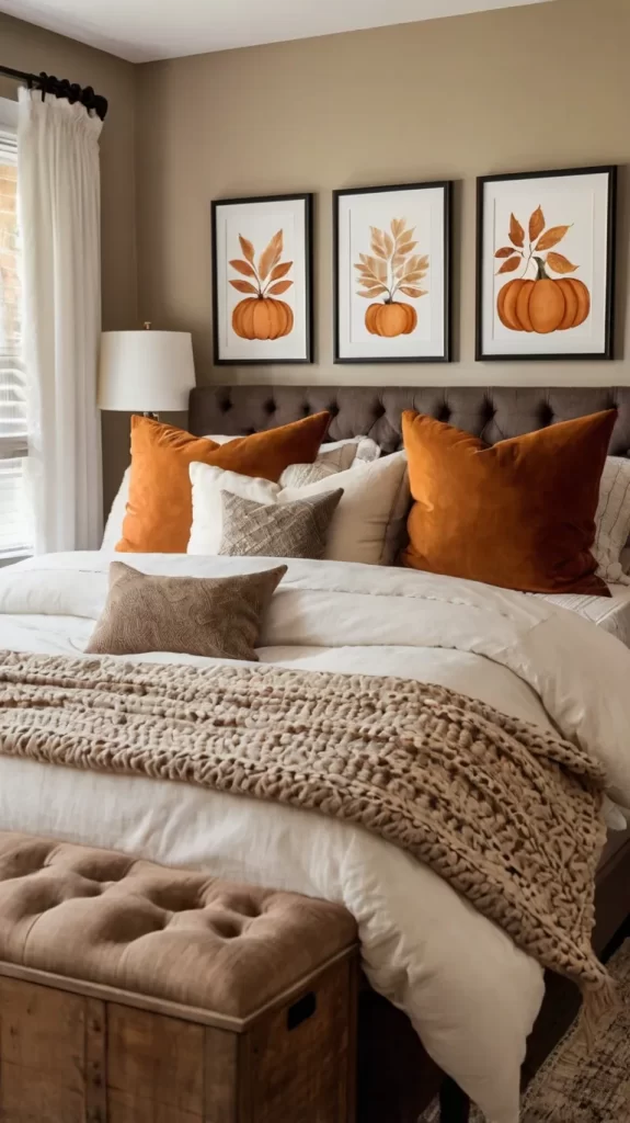 - Select 3–4 printable or framed fall prints (pumpkins, leaves, cozy sayings).