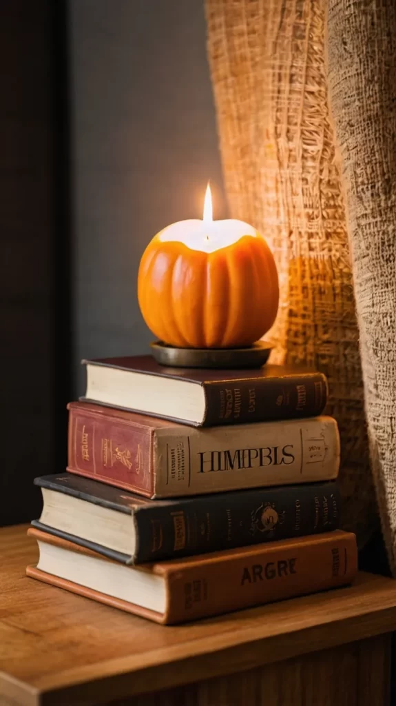 Tip: Use actual books you’d enjoy reading by a fall candlelight glow!