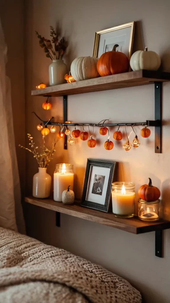 Style a floating shelf with mini pumpkins and cozy accents.
