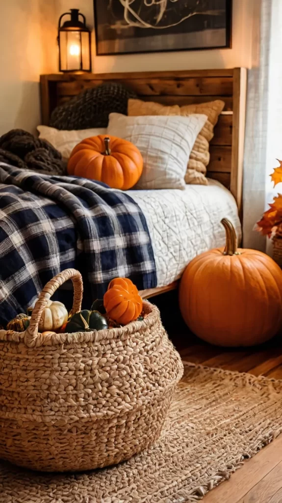 - Fill with plush pumpkins or rolled-up plaid throws.