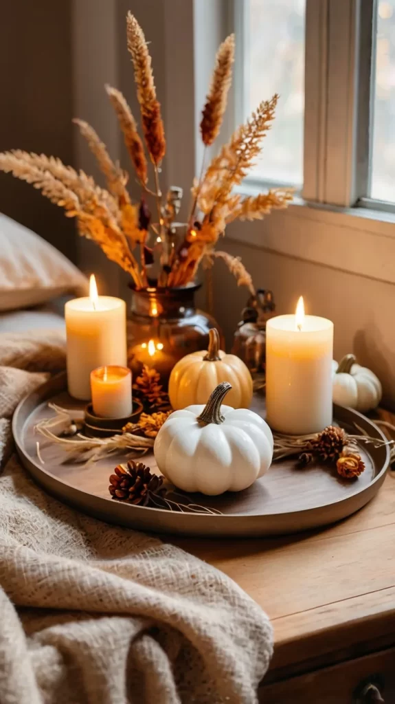 - Add a small pumpkin, seasonal candle, and vase with dried florals.