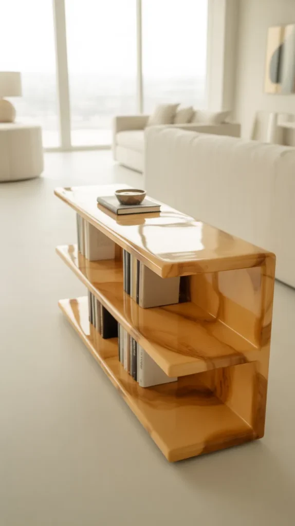 A clear gloss epoxy bookshelf is perfect for a modern and clean home. This design uses simple wooden shelves coated with a high-gloss epoxy finish. The result is a smooth, glass-like surface that enhances the natural wood grain. It looks premium but can be created on a budget using plywood or MDF boards.