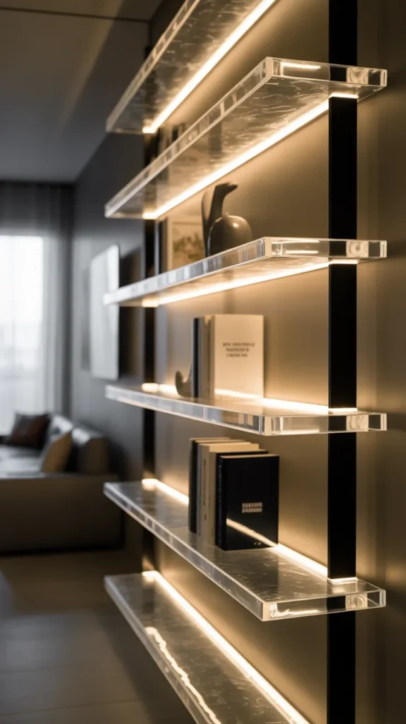 This design uses thick clear epoxy to create a glass-like floating shelf. It gives a futuristic and clean appearance.