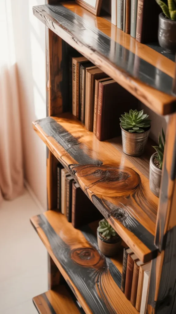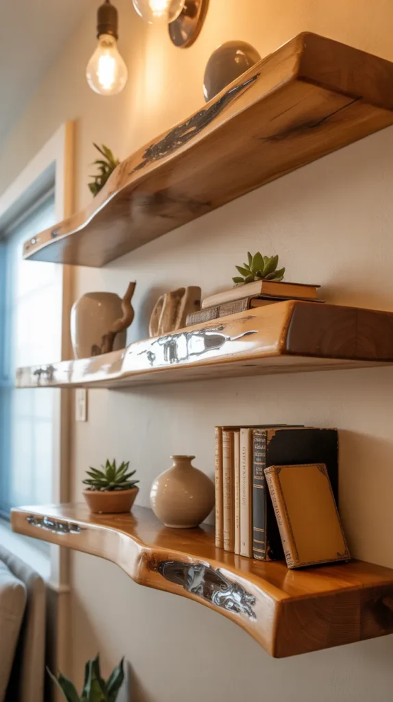 Live edge shelves keep the natural shape of wood, including its curves and edges. When combined with epoxy filling in cracks and gaps, the result is a rustic yet modern look. These shelves feel warm and organic.