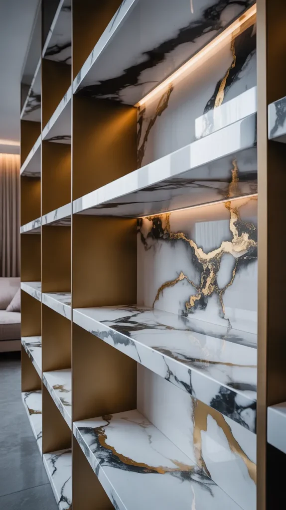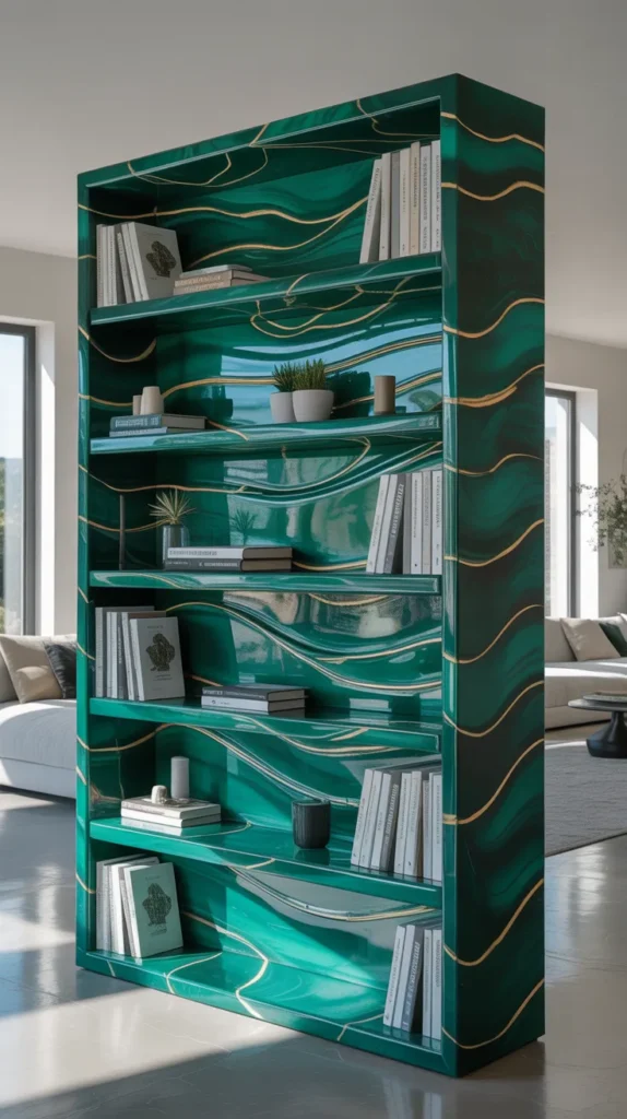 A marble effect epoxy bookshelf gives a luxury look without the high cost of real marble. This design uses white epoxy with black or gold veins to mimic marble patterns. It works well with simple shelf structures.