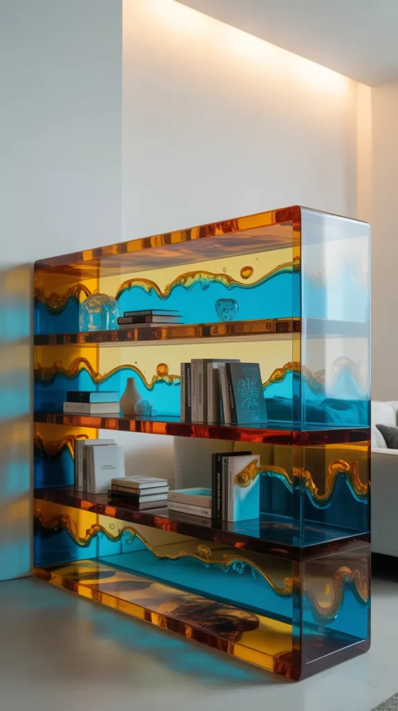 The epoxy river bookshelf is one of the most popular trendy ideas today. It features two wooden slabs with a colored epoxy “river” flowing between them. Blue and turquoise shades are commonly used to create a natural water effect.