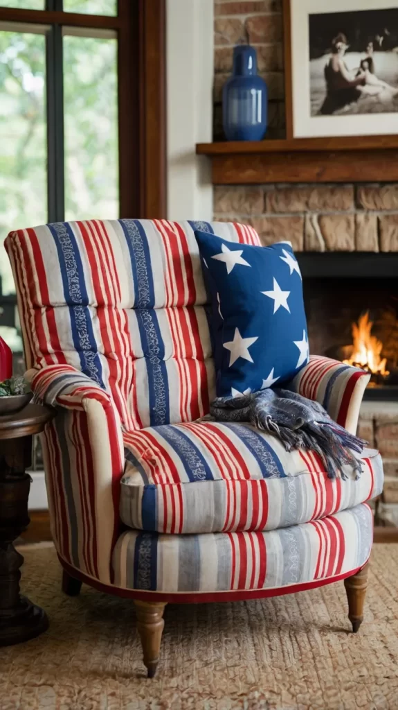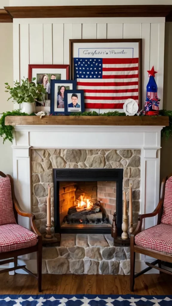 Place red, white, and blue-themed pillows near the fireplace seating for extra festive comfort.