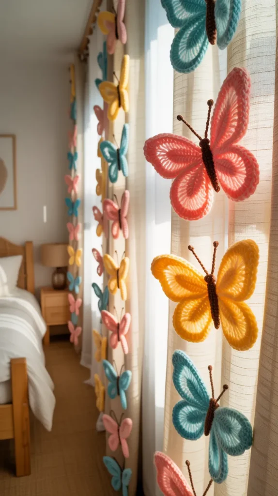 Butterfly crochet curtains bring lightness and beauty into a room. Colorful crochet butterflies placed across sheer curtains create a soft and dreamy look. This design works especially well in bedrooms where a calm and cheerful mood is desired.