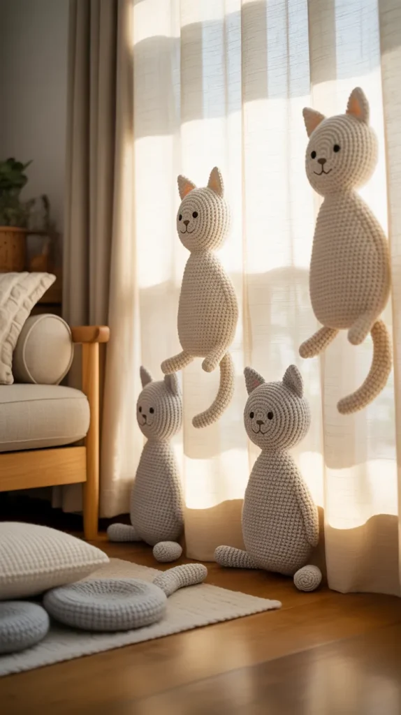 Cat crochet curtains are perfect for cozy homes and pet lovers. These curtains often feature crocheted cat shapes sitting, stretching, or peeking from the sides. Soft yarn colors like gray, cream, and brown blend easily with modern living room decor. The crochet texture adds warmth, making the room feel comfortable and inviting.