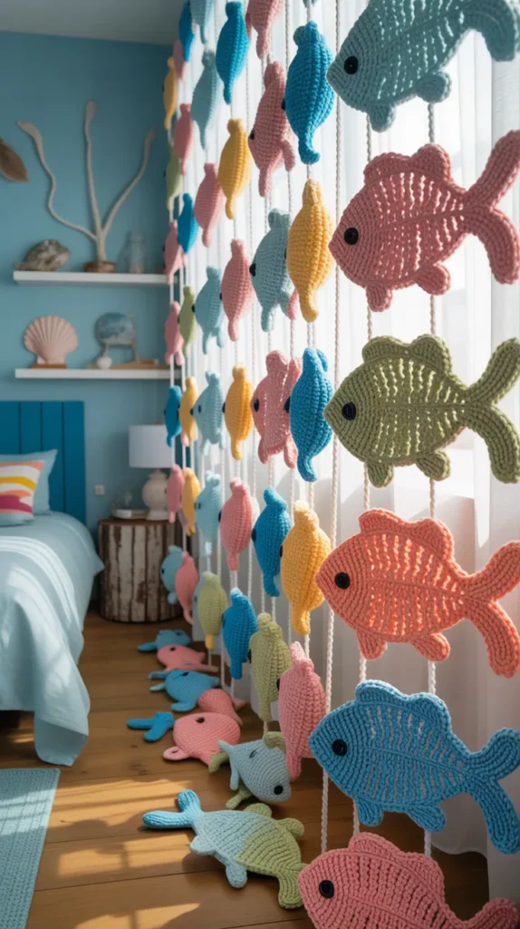 The crochet fish add texture and color, making the curtains feel lively. Pair them with simple furniture so the design stays balanced. Fish curtains are perfect for homes that enjoy playful decor.