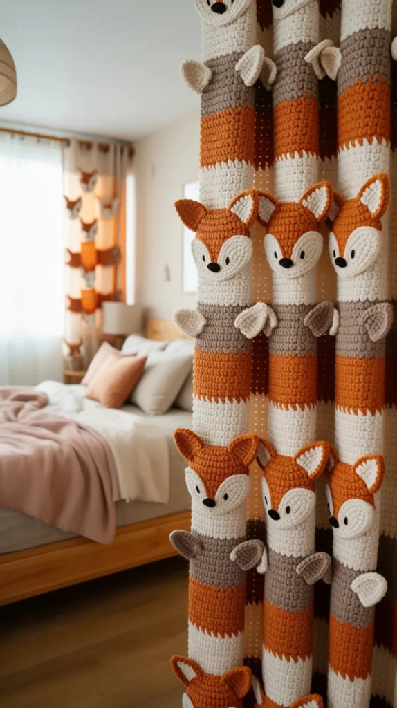 Fox crochet curtains feel clever and cozy. Fox designs often use orange, white, and brown yarn, which adds warmth to the space. They work well in bedrooms and creative living rooms.