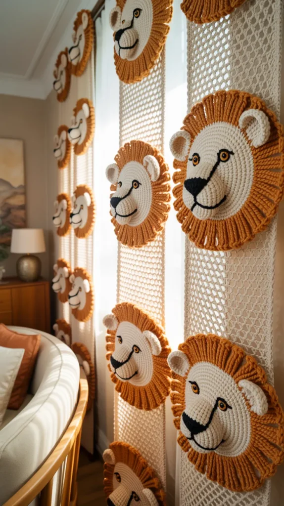 Lion crochet curtains add a bold yet playful touch. Lion designs work well in living rooms or themed bedrooms. Warm colors like gold and brown create a strong visual effect.