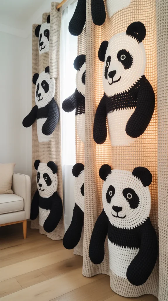 Panda crochet curtains use simple black and white designs that feel calm and modern. Panda shapes add cuteness while keeping the look clean.