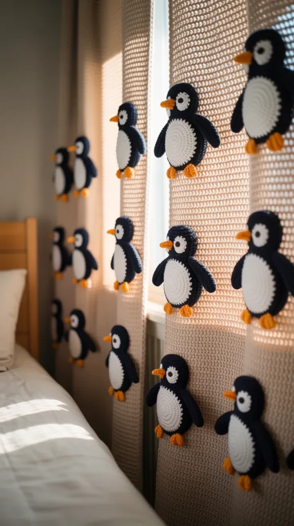 Penguin crochet curtains feel cute and cozy. Black, white, and soft blue colors create a calm and winter-inspired look.