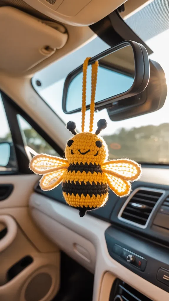 A bee crochet keychain is bright and cheerful with yellow and black stripes. It adds happy color to keys, bags, and car mirrors. Small wings and a smiling face make it extra cute.