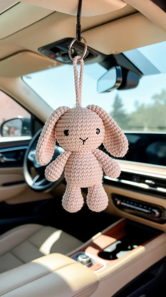 A bunny crochet keychain adds a soft and sweet style to your space. Long ears, pastel yarn colors, and tiny embroidered eyes make it ideal for spring decor, nursery accessories, or cute car mirror decor. It looks lovely with feminine, minimalist, or pastel room themes.