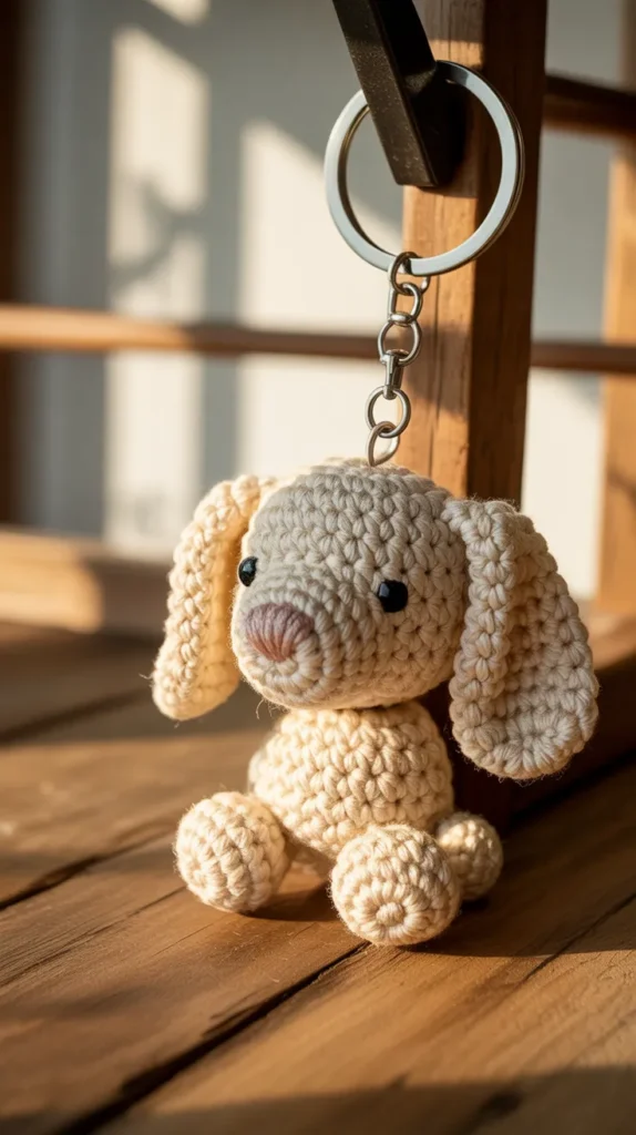 A dog crochet keychain is a heartwarming decor item for dog lovers. With floppy ears and a happy face, it brings cheerful energy to everyday items. It can brighten your keys, office desk hook, or car interior.