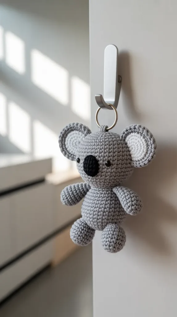 A koala crochet keychain has a calm and lovable look. Gray yarn, round ears, and a soft face make it perfect for modern minimal decor styles. It suits neutral car interiors, desk decor, and keyrings.