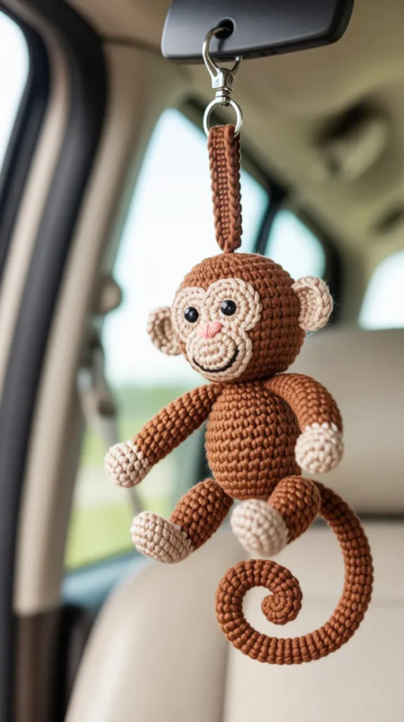 A monkey crochet keychain is full of fun energy. With long arms or a curly tail, it becomes a playful item for cars, kids rooms, or school bags. Brown yarn tones give it a warm natural look.