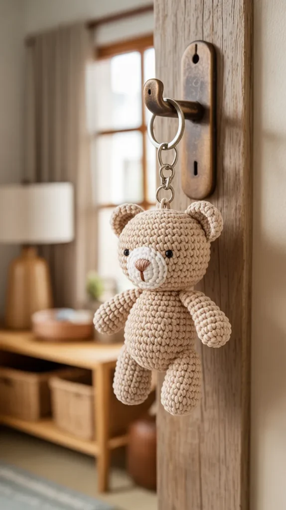 A teddy bear crochet keychain is a classic choice that never goes out of style. The soft brown or beige yarn creates a warm and friendly look that works well in home decor and car accessories. It can hang on a car mirror, nursery wall hook, handbag, or keyring with ease.