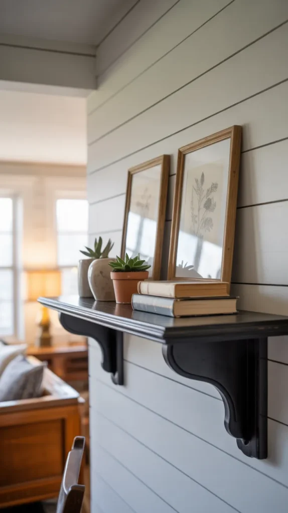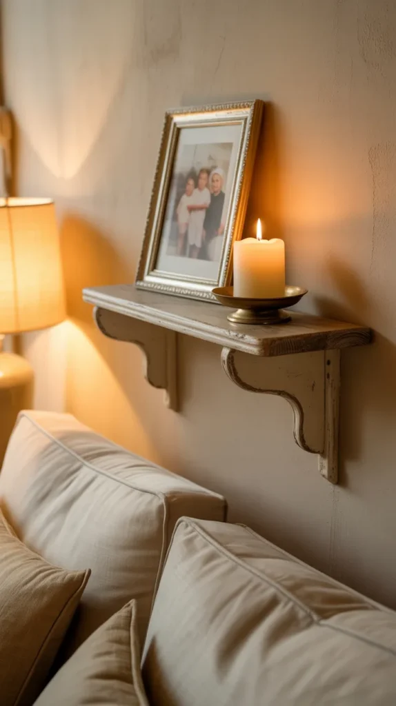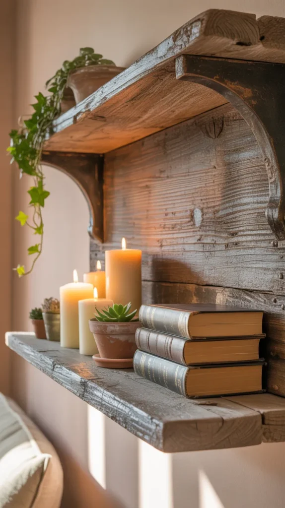 A floating antique wall shelf combines vintage charm with modern simplicity. The hidden brackets create a clean look while the aged finish keeps it classic. This style works well in contemporary homes that want a touch of history.
