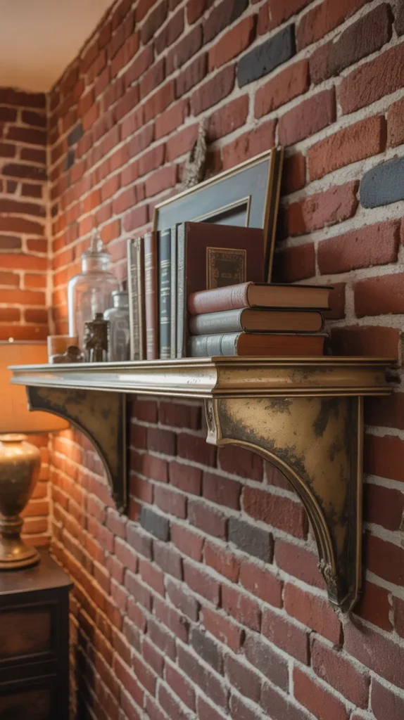 An antique brass wall shelf with metal brackets adds a vintage industrial touch. The warm gold tone of brass looks beautiful against dark walls or exposed brick. It is perfect for displaying books, decorative jars, or small sculptures.