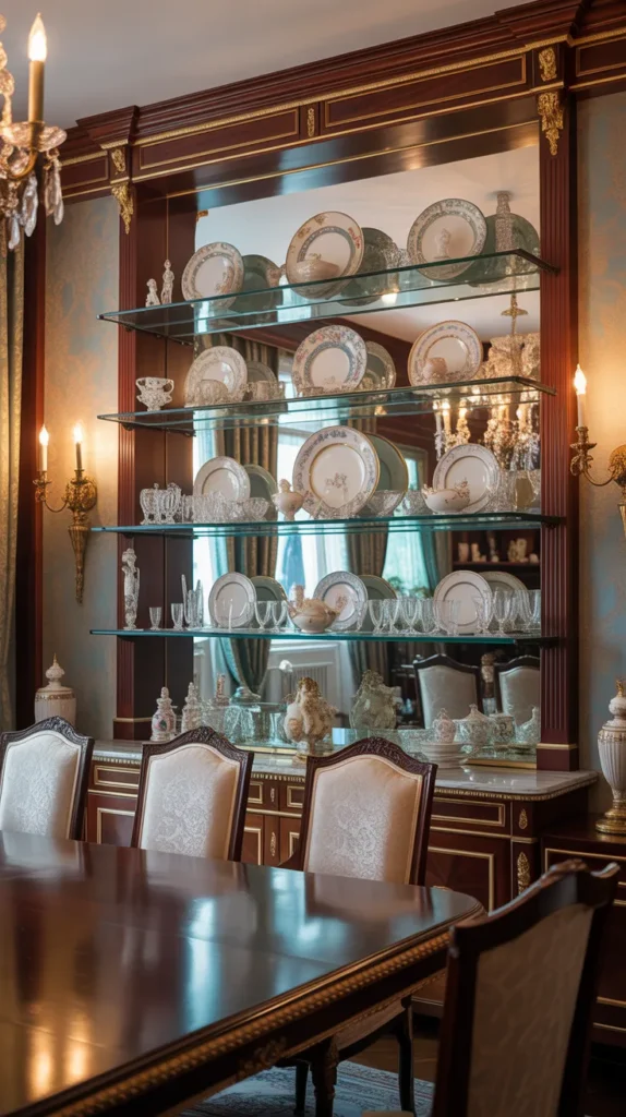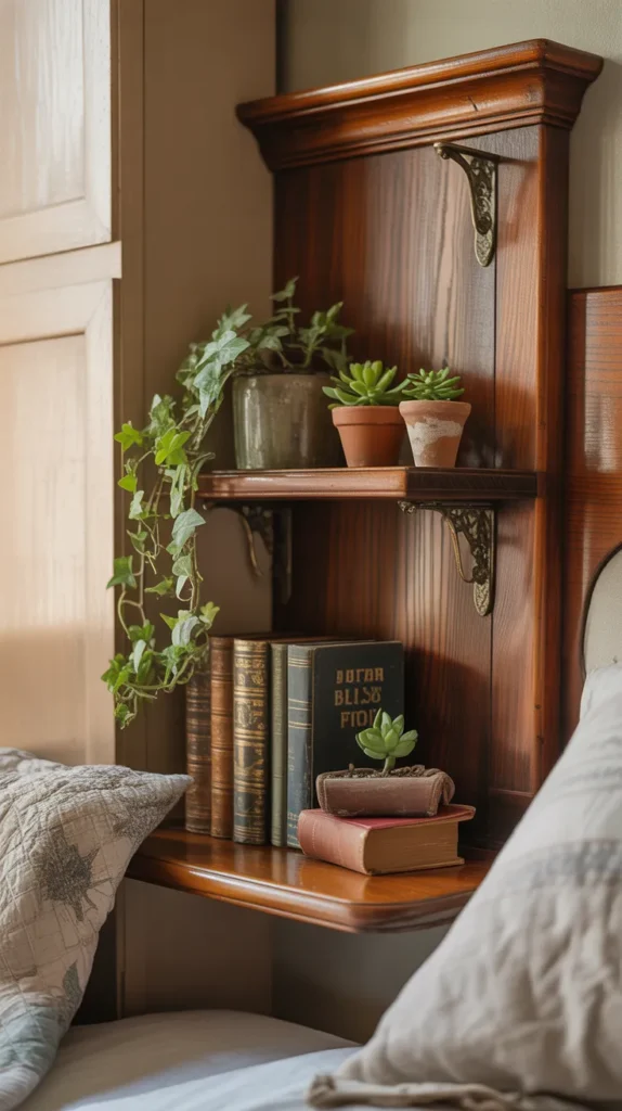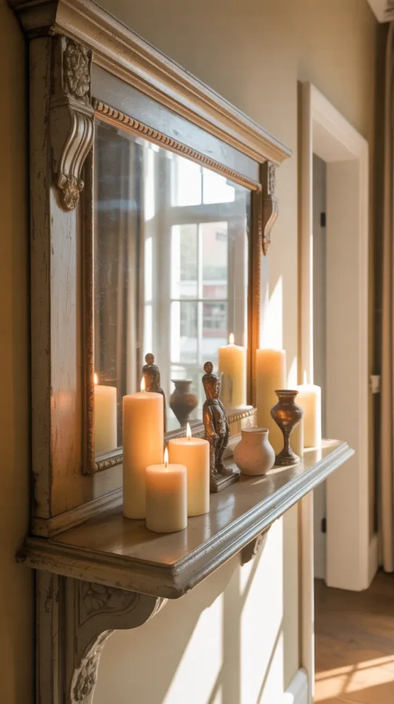 An antique wall shelf with a mirror back adds depth and light to a room. The mirror reflects decor items and makes the space feel larger. It is perfect for small apartments or narrow hallways.