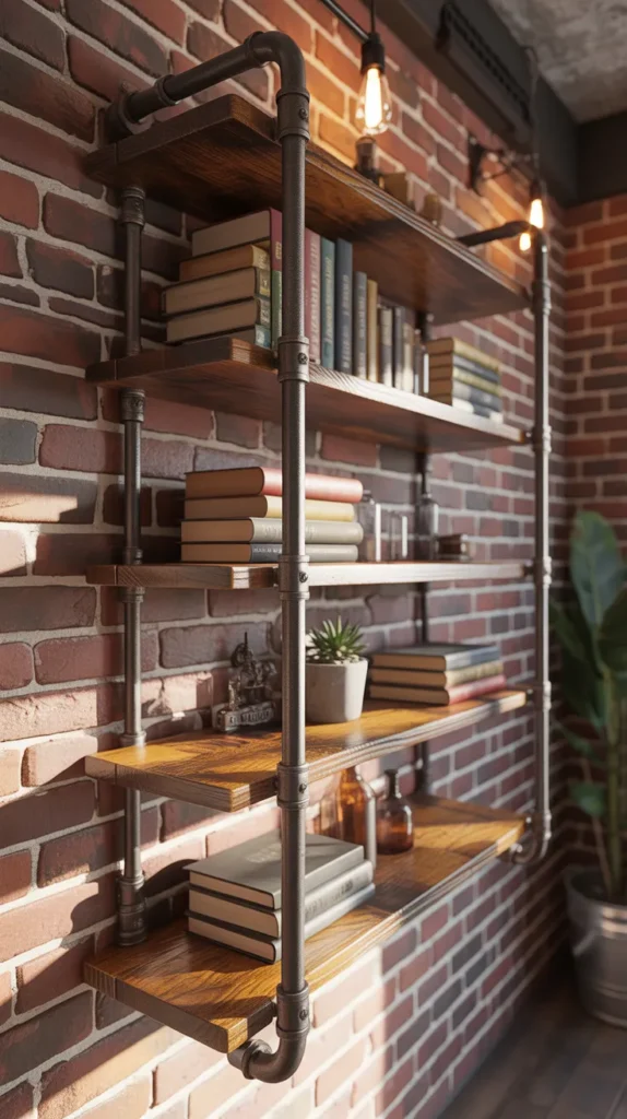 An antique industrial pipe wall shelf combines metal pipes with aged wood. It creates a bold and practical look for loft-style homes or home offices. The sturdy structure supports books and decor items.