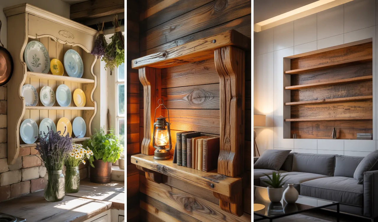 A reclaimed wood antique wall shelf offers eco-friendly charm. The natural imperfections and aged texture create a unique look. This style fits well in rustic, farmhouse, and cabin-inspired interiors.