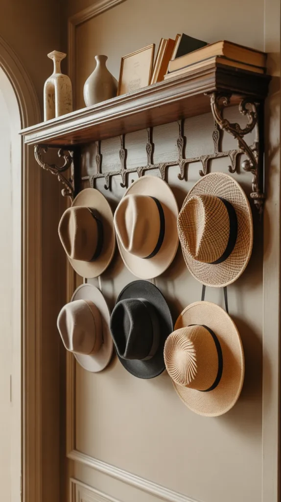 An antique wall shelf with hooks is both decorative and practical. It works perfectly in entryways or mudrooms for hanging keys, hats, or bags. The vintage design adds personality to everyday storage.