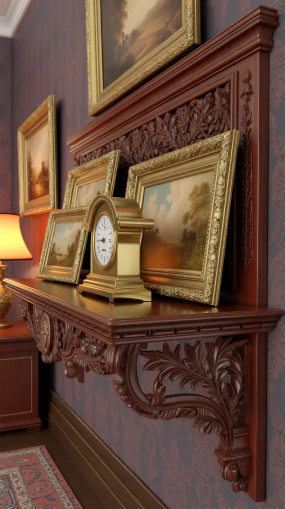 An ornate carved antique wall shelf adds elegance and detail to your home. These shelves often feature floral patterns, curved edges, and decorative brackets. They look stunning in traditional living rooms, bedrooms, or hallways where you want a touch of luxury.