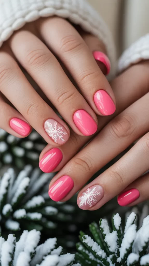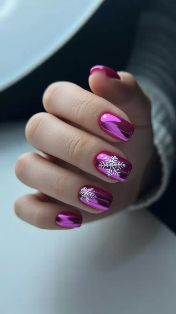 Use a chrome powder (or chrome-effect polish) over Barbie pink as the base to get a mirror-like metallic finish. This gives your nails a high-shine, futuristic look. On top of that, add small white snowflakes or frosty branches on accent nails. The mirror pink base makes the winter motifs pop.