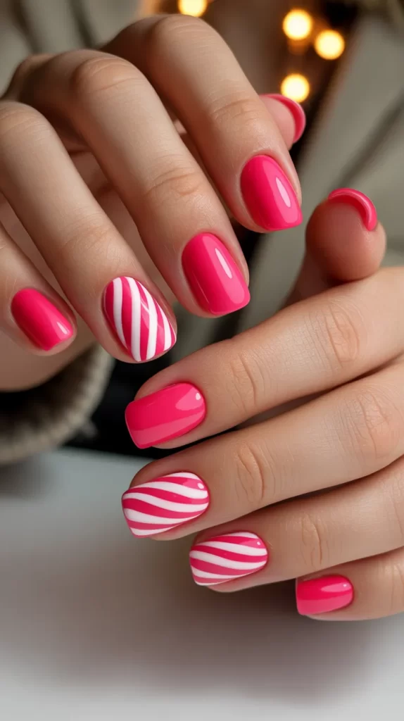 Paint a Barbie pink base, then draw candy cane–style diagonal stripes in white (and optionally silver) on accent nails. The stripes should alternate in thickness and direction for a playful touch. You could also use a superfine brush or striping tape to achieve clean lines. The pink + white stripes evoke the classic candy cane, but with a Barbie twist.