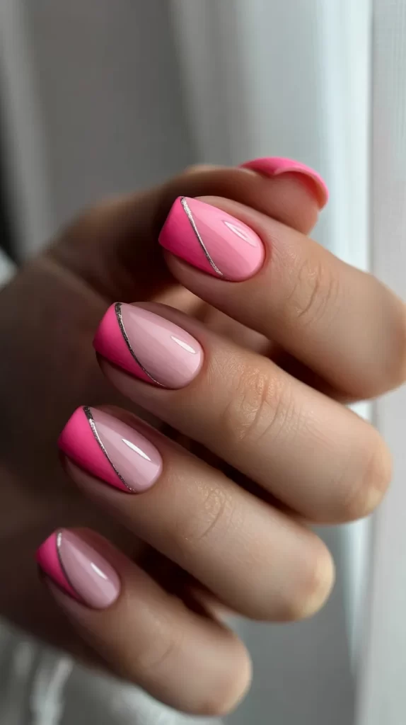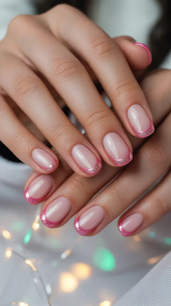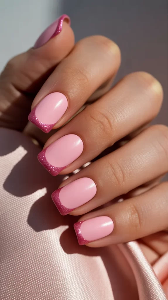 Use a matte Barbie pink polish over your entire nail. Let it dry fully to get that smooth, non-shiny finish. Then, on just the tips of each nail, apply a layer of fine pink glitter (matching or slightly lighter shade) that sparkles in the light. This gives you a two-texture contrast: flat matte pink and bright glittery tips. It’s elegant yet festive, and less busy than full glitter nails.