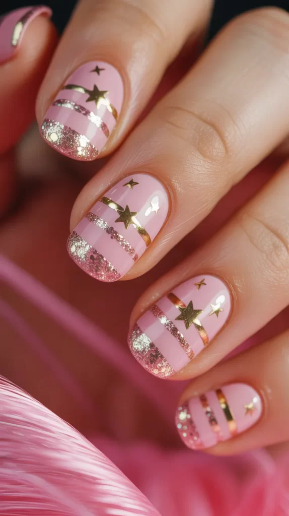 Paint your nails a solid Barbie pink. On accent nails, add vertical or diagonal stripes in gold foil or glitter. Between the stripes, place micro star decals or dots in white or silver so they peek through. The gold stripes bring warmth and festive glam, while the stars enhance the holiday touch.